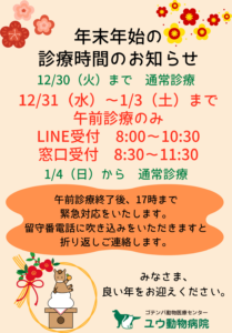 年末年始の診療時間のお知らせです。