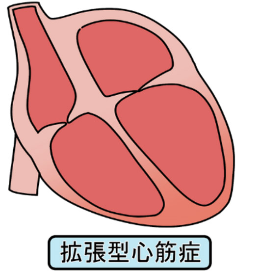 特徴 | 心臓の筋肉が薄くなり、心臓全体がブヨブヨと拡張して、全身に血液を送り出す収縮力が極端に低下する病気です。ポンプ機能が著しく低下するため、心臓が血液を十分に押し出せなくなります。犬で多く見られ、猫では稀です。 |