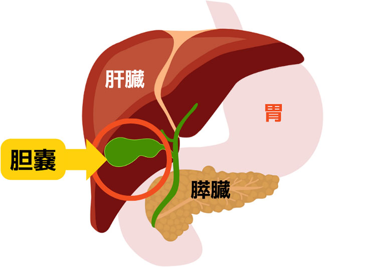 胆のうは、肝臓の下にある小さな袋状の臓器で、胆汁を一時的に貯蔵しています。食事のたびに収縮し、胆汁を小腸へ送り出すことで、脂肪の消化を助けます。
