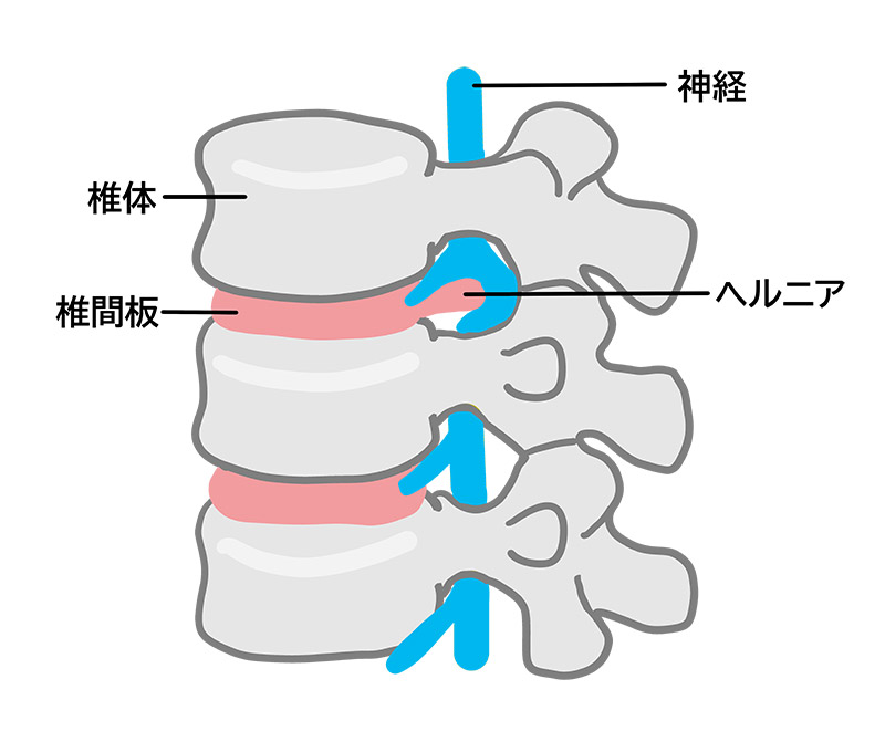 しかし、この椎間板が何らかの原因で変性し、本来の位置から飛び出して、すぐそばを通る脊髄(せきずい)という重要な神経の束を圧迫してしまうのが、椎間板ヘルニアです。