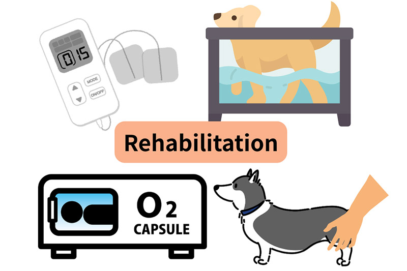 手術後は、愛犬が再び自分の足で立てるようになるために、入院して専門的なケアを受け、その後、綿密なリハビリテーションが必要になります。スタッフの手を使用した徒手リハビリのほか、歩く力を取り戻すために様々な専門機器を使用してリハビリを行います。