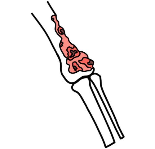 病院での診断は触診とレントゲン検査、関節液検査で比較的簡単に見つけることができます。