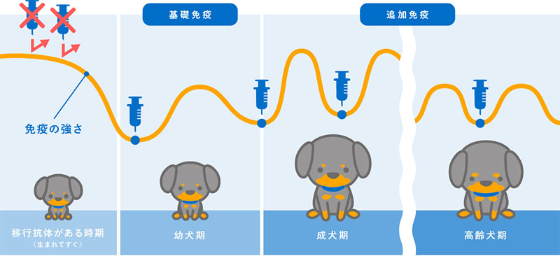 はい、違います。特に子犬や子猫は、お母さんからの免疫(移行抗体)の影響を受けるため、適切な時期に複数回のワクチン接種が必要です。